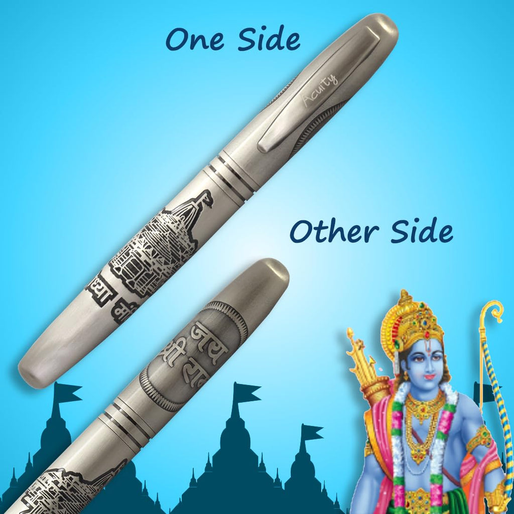 Home Acuity Pens Acuity Ayodhya Mandir Ball Point Pen with Jai Shree Ram Engraved on Cap - Metal Pen with Classy Chrome Finish - Comes in a Pen Box - Ink Colour Blue - 20003