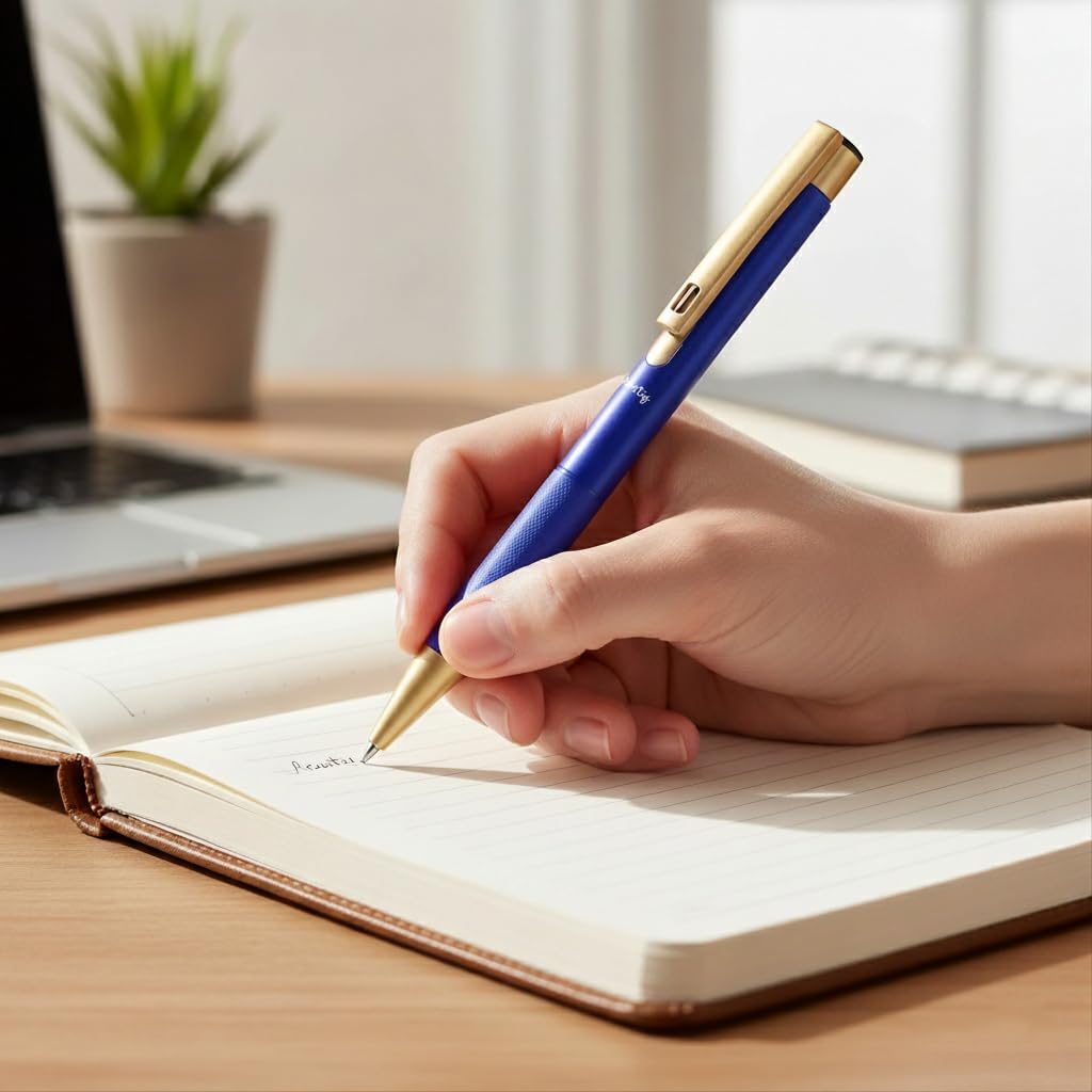 Ball Point Pen. || Blue Shimmer Metal Body & Golden Clip. || Smooth ballpoint writing experience, durable build, and classy look for daily use or gifting. || Click Opening Mechanism - Retractable Ball Pen || Gift-Ready Packaging – Comes in a pen pouch, making it suitable for office gifting, festive celebrations, or personal keepsakes. || Dimensions - Length: 13.7cm, Width: 1cm, Weight: 17g || Blue Ink.