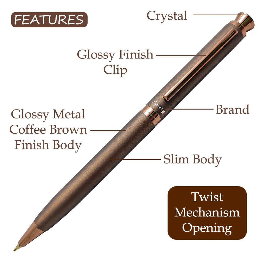 • Acuity Coffee-Scented Blue Ink Ball Point Pen | Dark Brown Finish Metal Body with Glossy Clip & Crystal on Top | Coffee Fragrance Smell Ink | It Comes in a Pouch | 30047