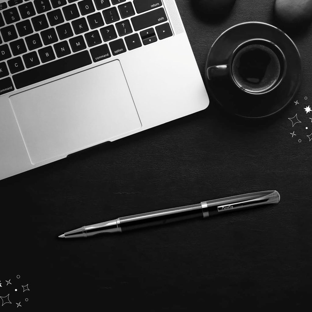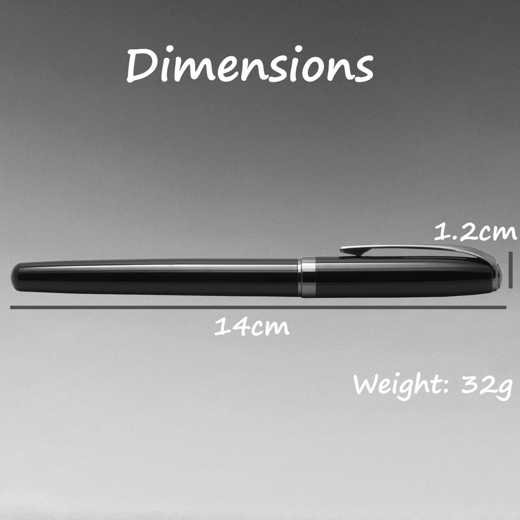 Roller Gel Pen || Glossy Black Metal Body with Metallic Black Accessories || It Comes with a Pen Pouch || Dimensions - Length: 14cm, Width: 1.2cm, Weight: 32g