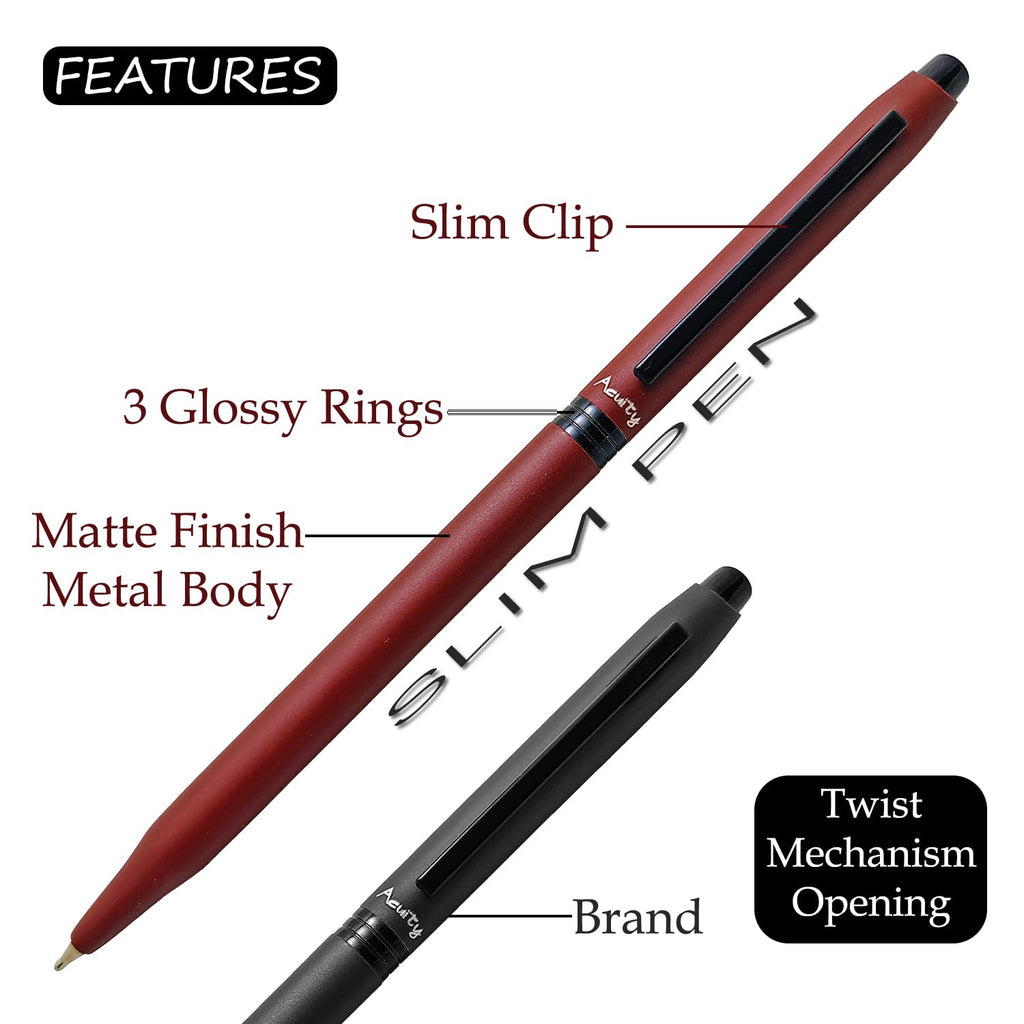 Home Acuity Pens Acuity Slim Ball Point Pen Set - Metal Body with Matte Finish, and Glossy Black Clip – Ink Colour Blue - It Comes in a Pouch - (Set of 2 Pens – Maroon & Black) - 10029