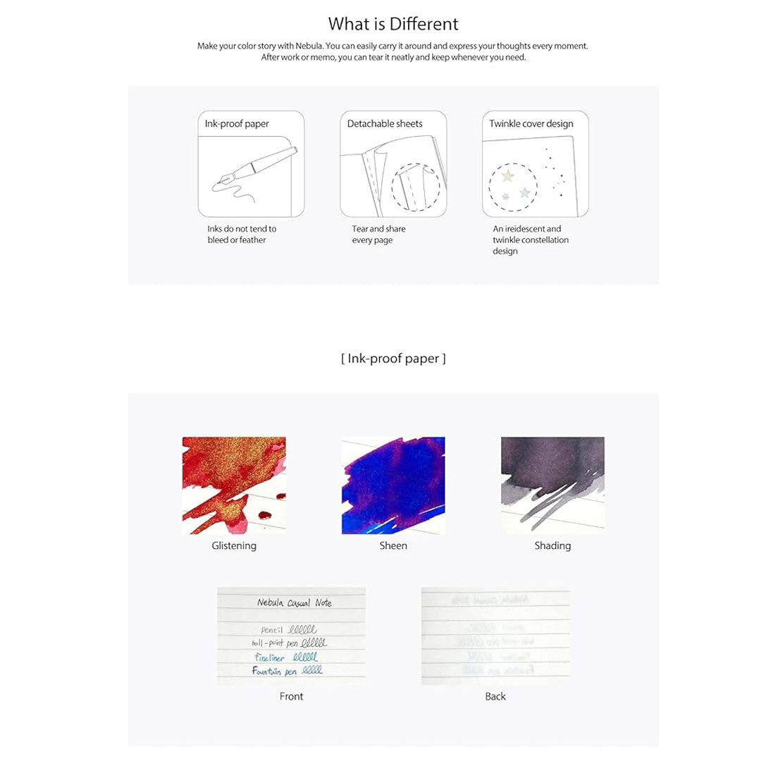 The Nebula Note Casual, which comes in three formats: ruled, dotted or plain (blank) pages, is made of high-quality papers and can be used with all types of writing instruments including fountain pens without compromise. Soft cover, ink proof paper tends not to bleed or feather, featuring an iridescent and twinkle constellation design. Designed by Colorverse, this notebook has perforated detachable sheets for easy tearing. Make your color story with Nebula. You can easily carry it around and express your thoughts. After work or memo, you can tear it neatly and keep whenever you need.