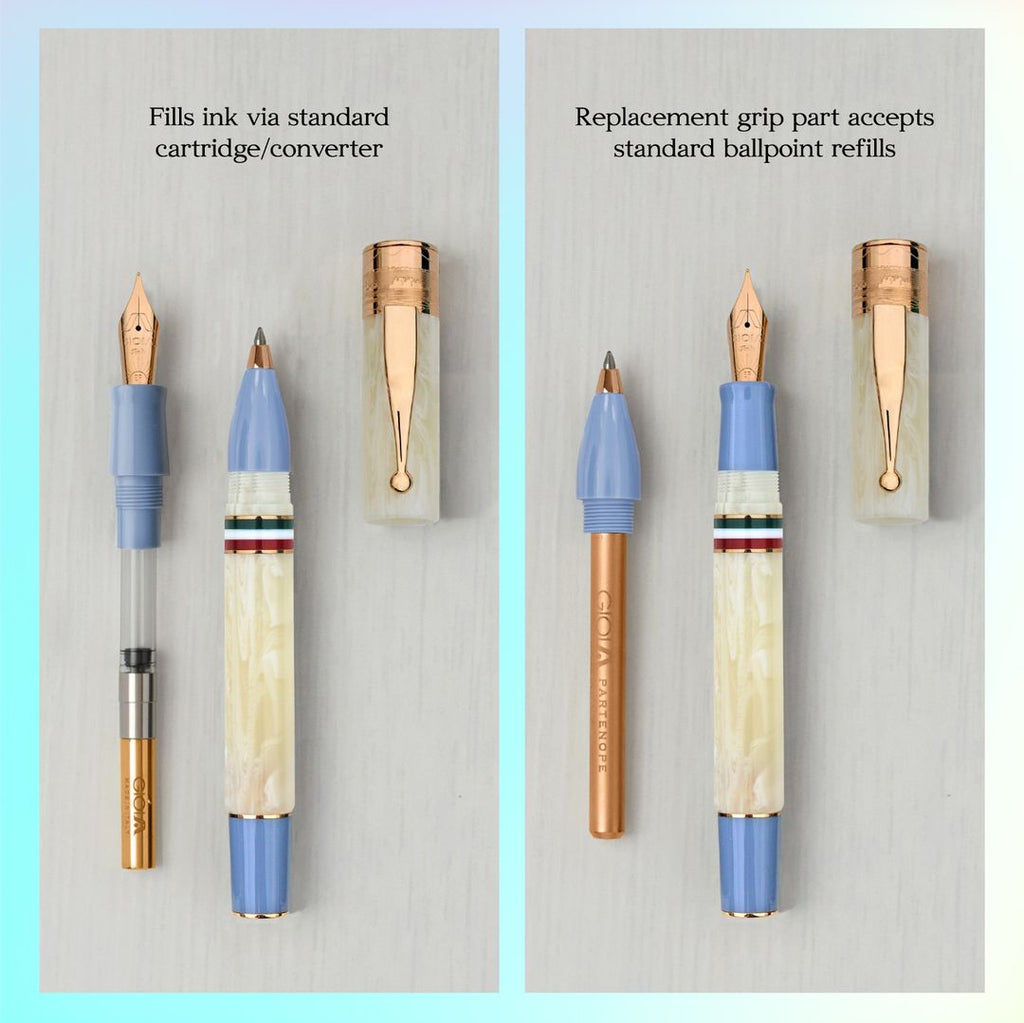 Gioia Partenope combines fountain pen and rollerball pen with an interchangeable grip section that allows you to choose your favorite writing instrument just before use it. Unscrew the grip part with the fountain pen nib and screw the grip part with the ballpoint pen refill and start to write again! Partenope Ivory features an ivory resin body with the Italian flag between two rose gold rings. The beauty of Naples gulf with the mount Vesuvio behind is engraved on cap. Fountain pen is fitted by a steel nib and fills ink via standard cartridge/converter. The "rollerball" replacement grip part accept standard ballpoint refills.