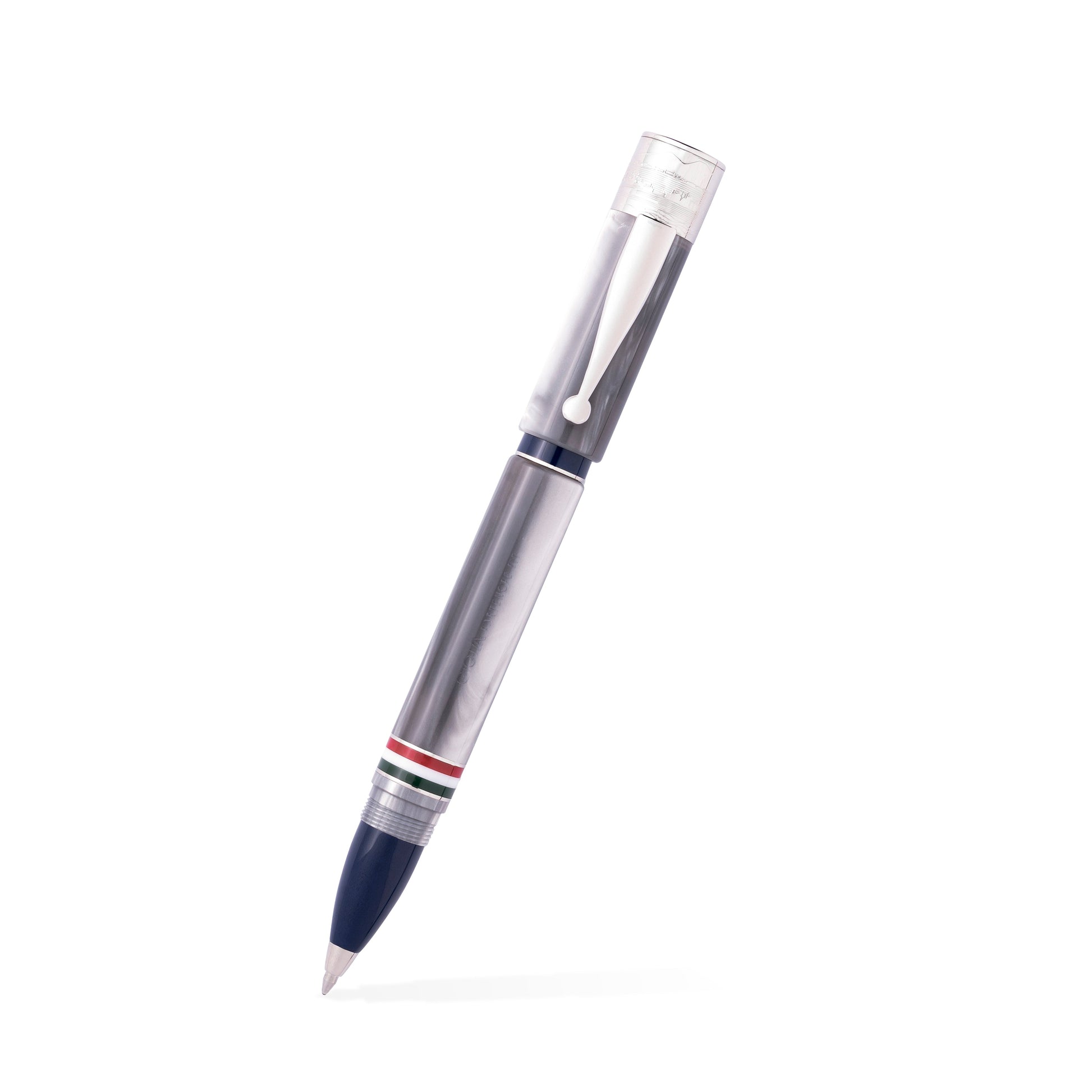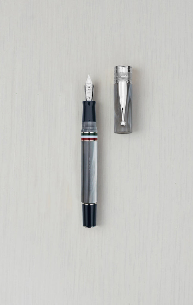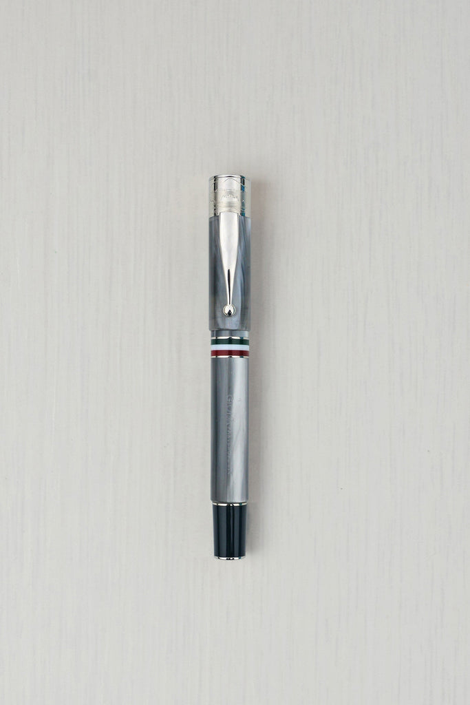 Partenope Pearl features a perlescent gray body with the Italian flag between two gold rings. The beauty of Naples gulf with the mount Vesuvio behind is engraved on cap. Fountain pen is fitted by a steel nib and fills ink via standard cartridge/converter. The "rollerball" replacement grip part accept standard ballpoint refills.