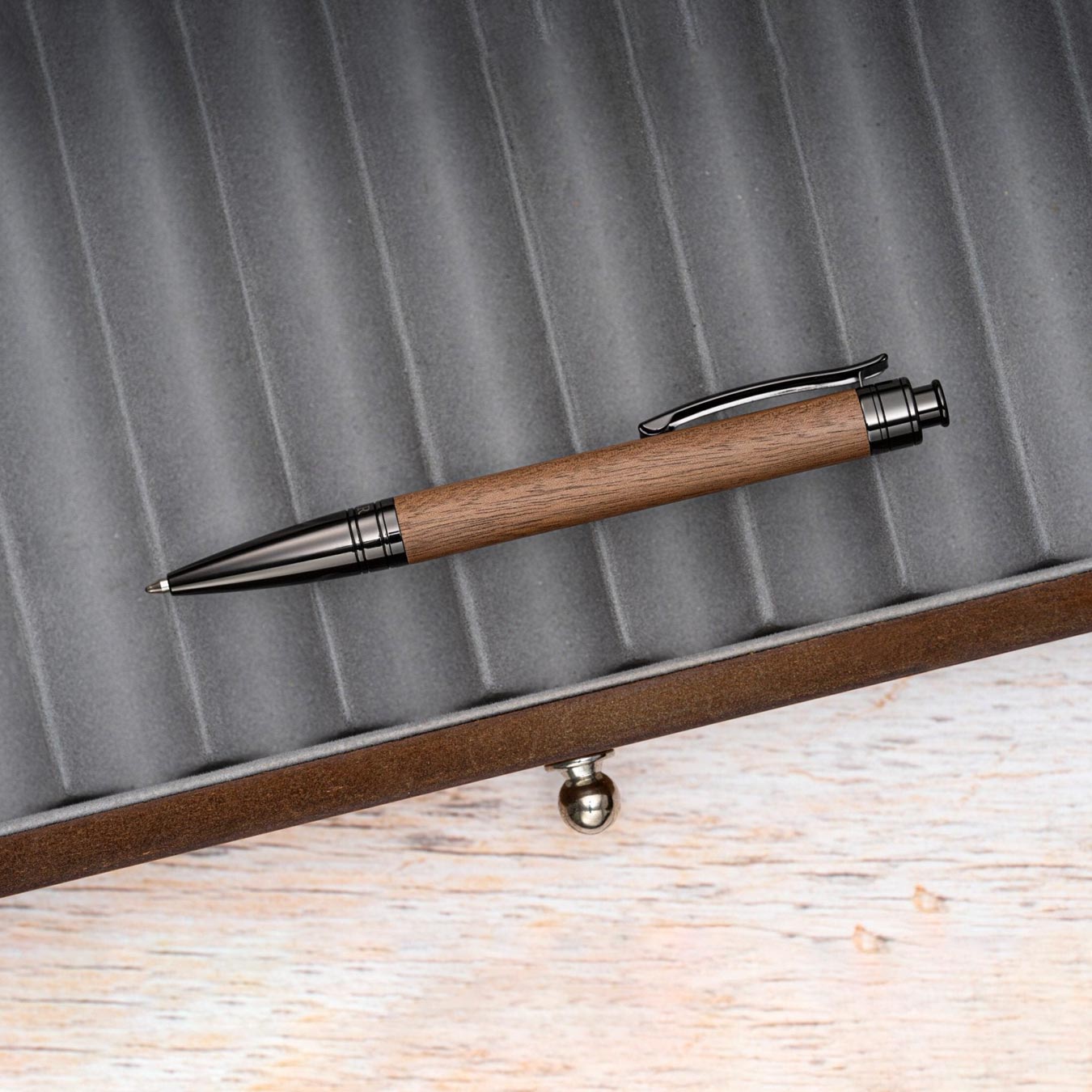 Discover the elegance of writing with the HÖRNER Boscus, the first push-button ballpoint pen in our collection, masterfully crafted from fine walnut wood. This pen combines traditional craftsmanship with modern functionality and offers an effortless writing experience thanks to its precise push-button mechanism. With a balanced weight distribution and the warm, individual grain of the wood, the Boscus lies comfortably in the hand and makes every note a personal expression of style and excellence.