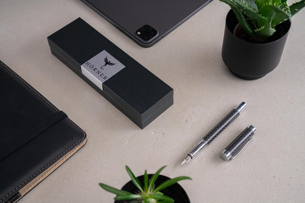 The Hörner One carbon fountain pen combines simple elegance with premium quality. Its high-quality workmanship gives it a long service life that you can enjoy for a long time. The processed metal threads ensure that there is a lot of stability at this sensitive point. The nib was made in Germany so that the fountain pen writes particularly softly.