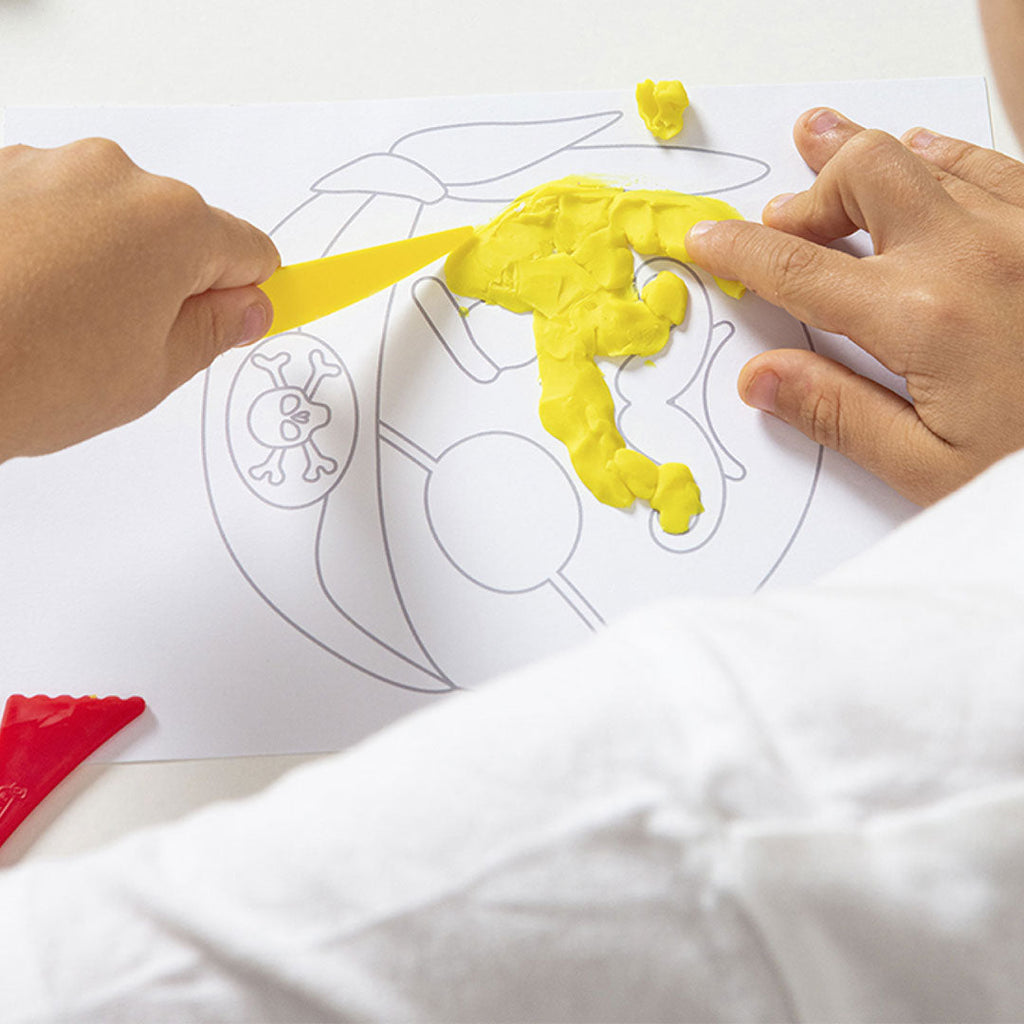 Each kit contains: reusable storage folder, 8 PASTEL colors PLASTILINA 50 gr bars, 3 pre designed templates, 2 free use templates, 1 white paper frame, 3 modelling tools, 1 roller, 1 instructions sheet.