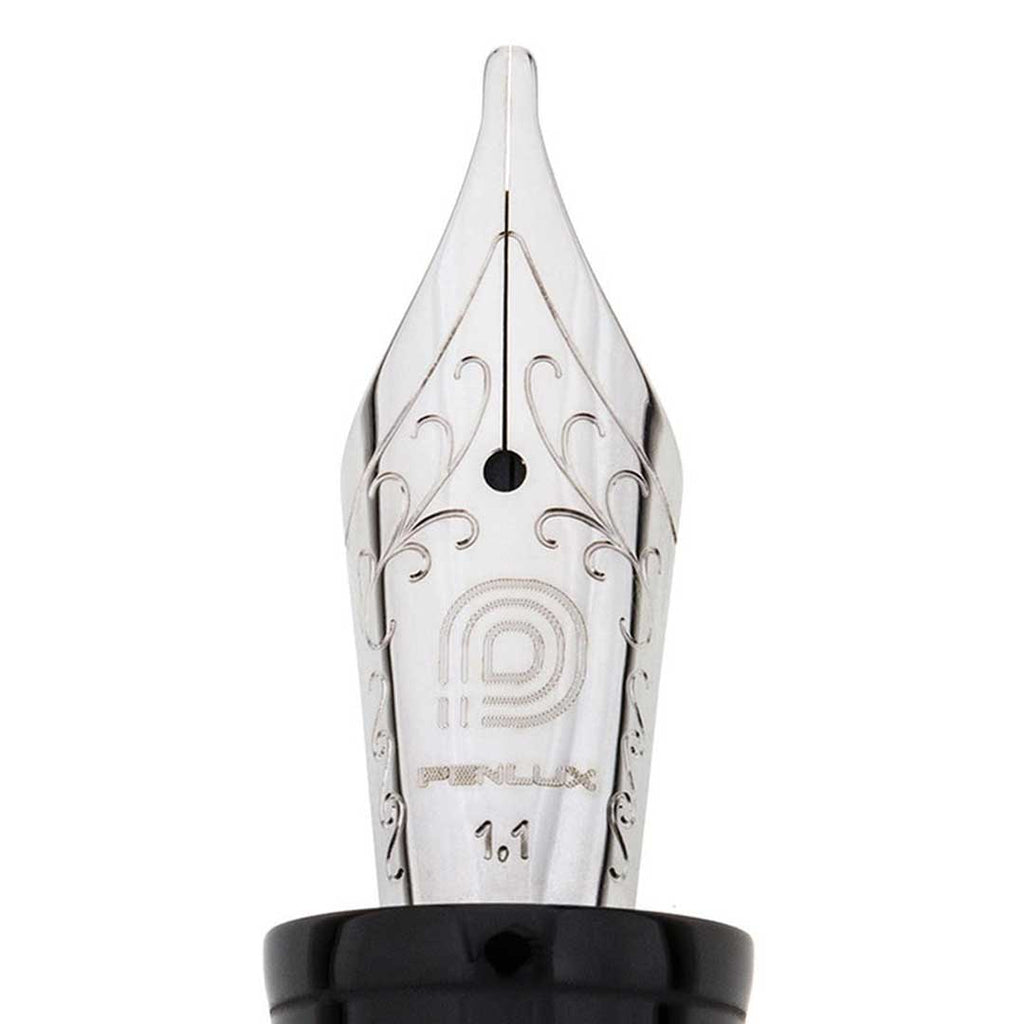 The Penlux Masterpiece Grande Black is a beautiful writing instrument that will turn heads! The stunning look of the translucent black PMMA resin body is complemented by chrome trims for a luxurious finish. The pen has a classic cigar shape like a Montblanc 149 or a Sailor 1911. The cap finial is a dome and sits atop a steel clip and clip ring. The top of the clip is squared, and it tapers down to a clip wheel. The cap gradually widens until reaching a steel cigar band style cap band at the end of the cap which has “Penlux” engraved in the middle with a coin edge pattern on the sides. Penlux manufactures their own piston mechanism which is one of the smoothest operating pistons. The aluminum piston system gives you a huge ink capacity, while the oversized body with the piston filling system makes this a terrific value. You'll love the smooth writing experience, and the highly polished acrylic resin body will last for years. The cap screws onto the barrel for closing, and pushing it onto the back when writing adds to the convenience and ease of use. The Penlux Masterpiece Grande Black is a perfect addition to any collection!