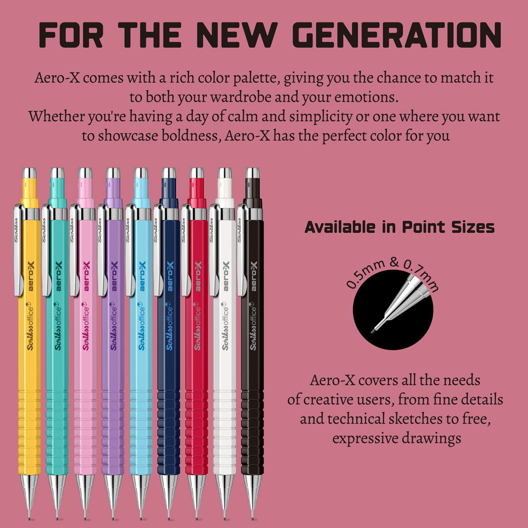 What makes Scrikss Aero-X so special is its modern philosophy: it's a mechanical pencil born from the desires and tastes of the younger generation. The creative process has been reversed—from the user to the design. Today's youth seek more than just functionality. They want an innovative, bold, and original product that reflects both their personal style and their mood. Aero-X answers these demands perfectly. With an ergonomic design and a lightweight plastic body, this pencil gives you the freedom to express yourself effortlessly.