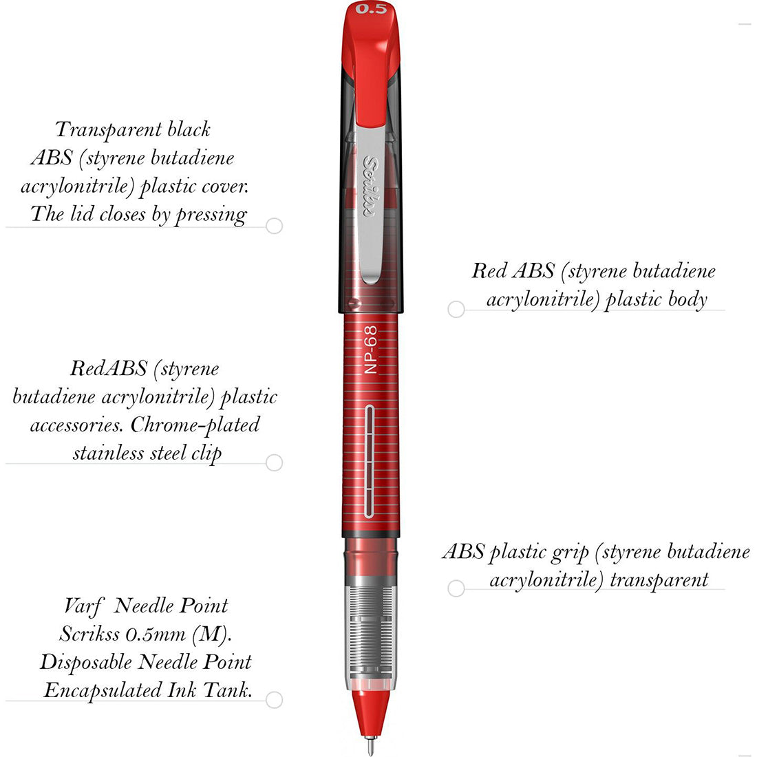 - Needle Point 0.5mm. Pen features Controlled ink flow control system, low viscosity ink, fast drying and increased visibility on paper, perfect ergonomics of the Grip.