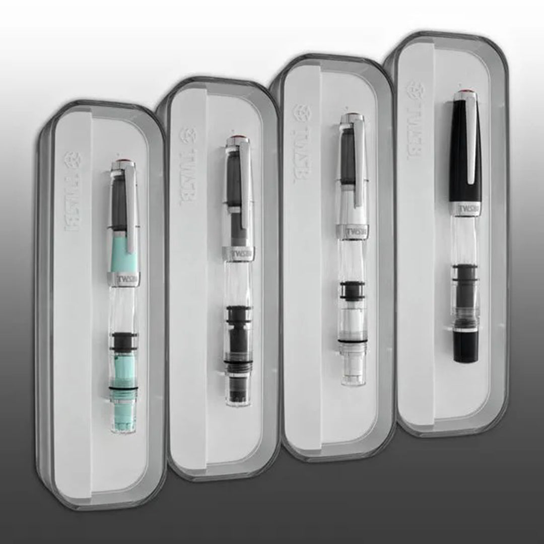 The TWSBI Mini comes with a benchmark piston ink-filling mechanism and has all detachable parts. Like many other TWSBI fountain pens, it features a crystal clear acrylic barrel so you can see your ink level, and a clear cap. It is completed with silver trim and a silver stainless steel nib.